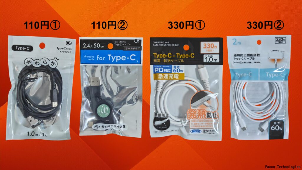 330円のUSBケーブルは加熱防止機能があるとの記載があるので110円のUSBケーブルよりは安全に使うことができるはず