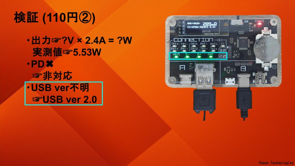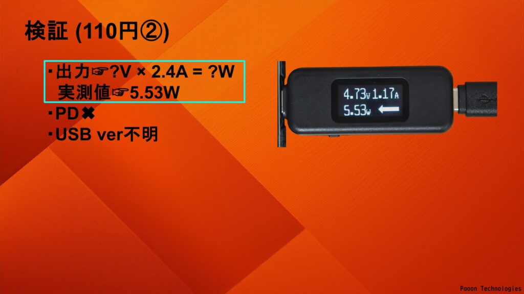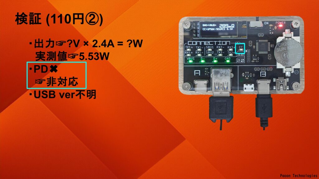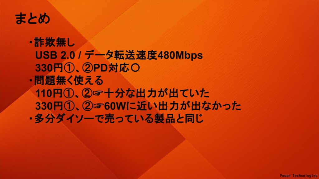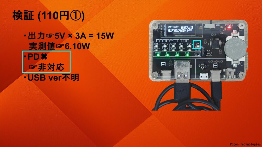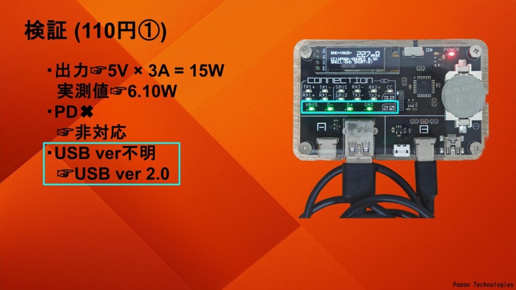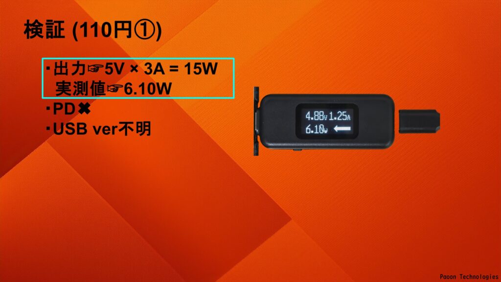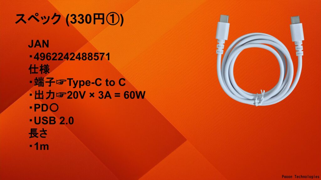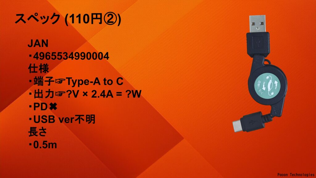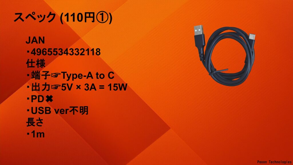 110円のUSBケーブルは安全装置等の機能の記載がないので安全性に疑問がある