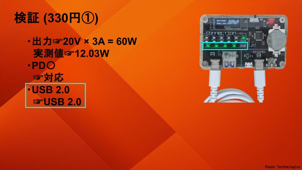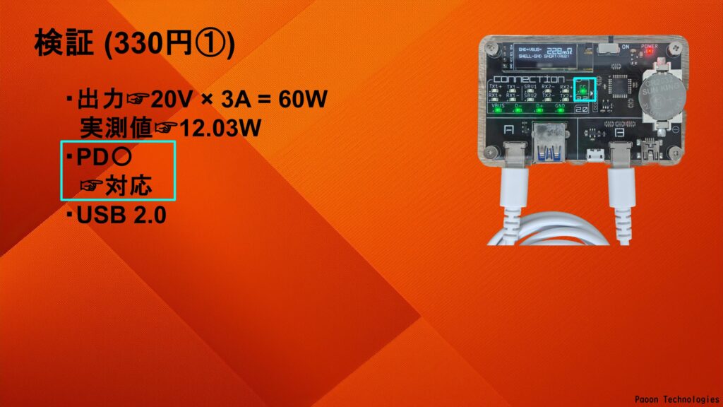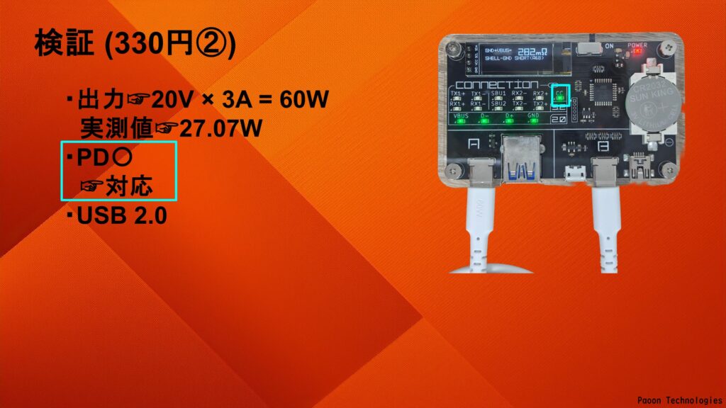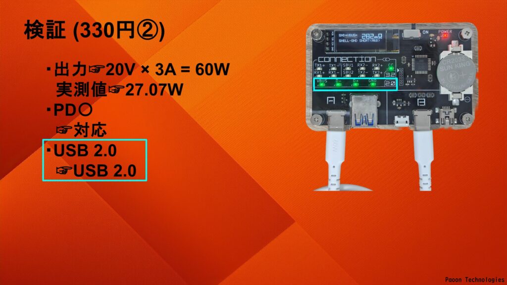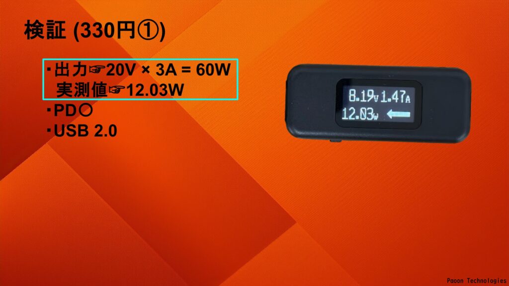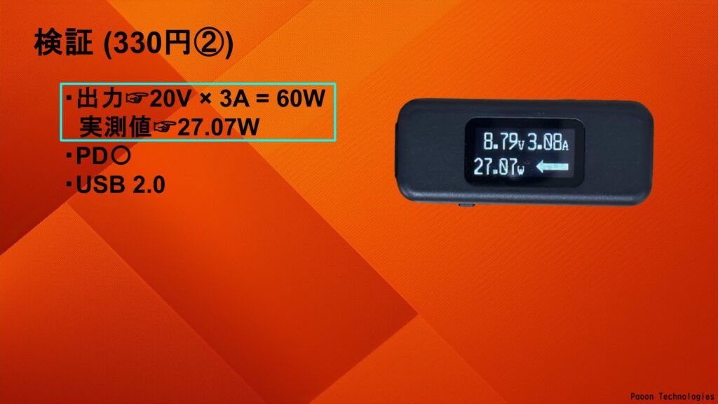 スペック60Wに対して30Wくらいの出力しか出なかったこれに関しては検証に使った機器の問題もあるかもしれない